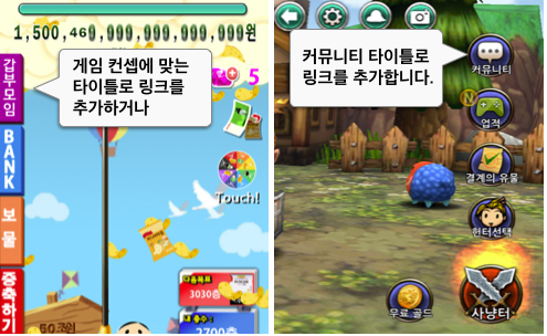 To make NANOO community effectively more active, insert in-game community links. Links to the community should be placed on the uppermost level where it’s most visible enabling frequent user visits, such as the game’s main screen. Number of active community users decrease by more than half if links are placed on a lower level, such as in settings menu.